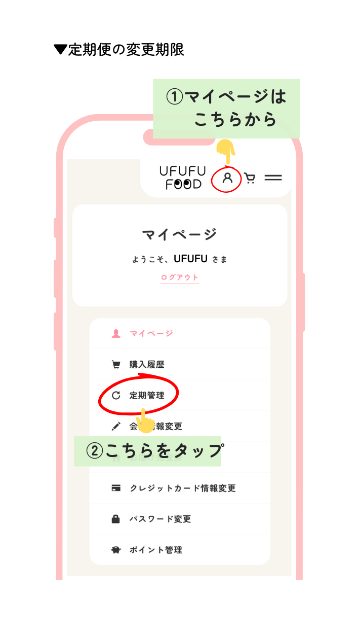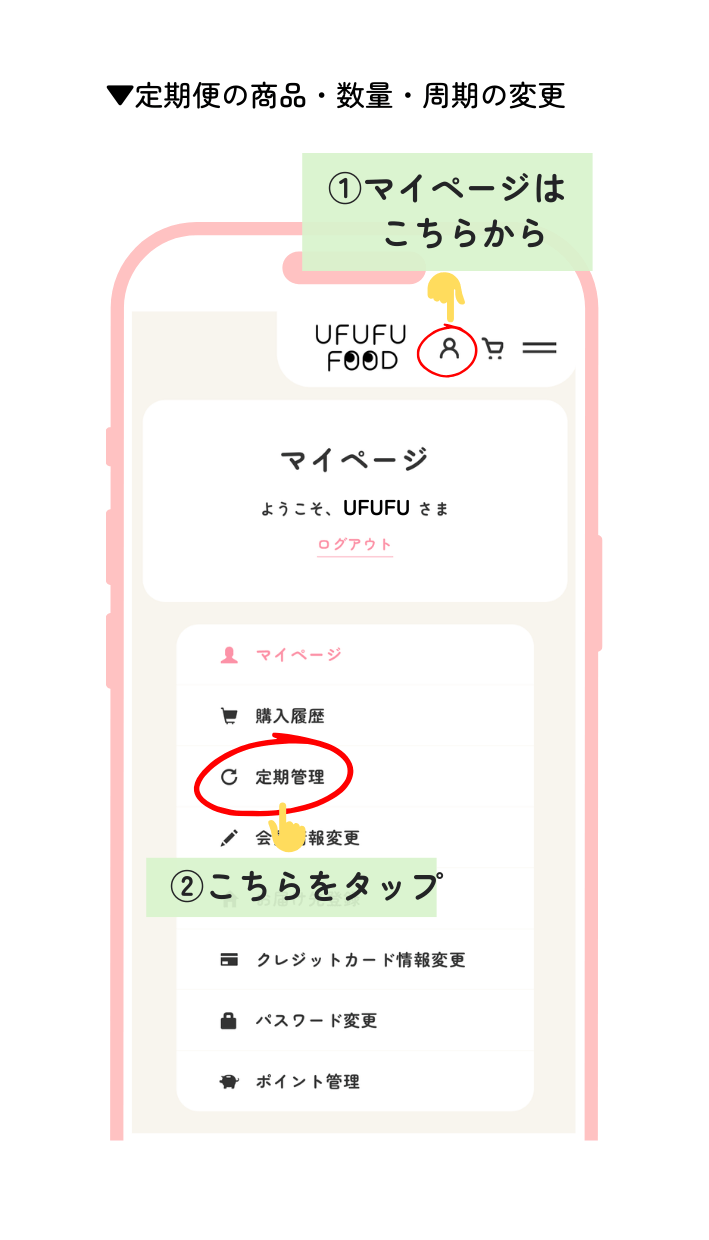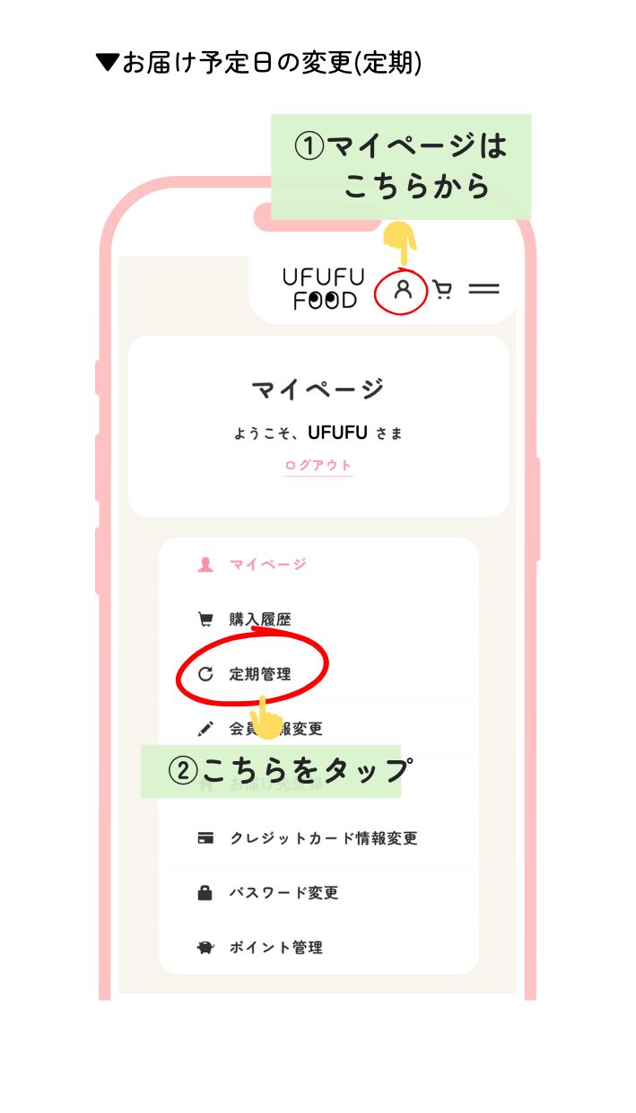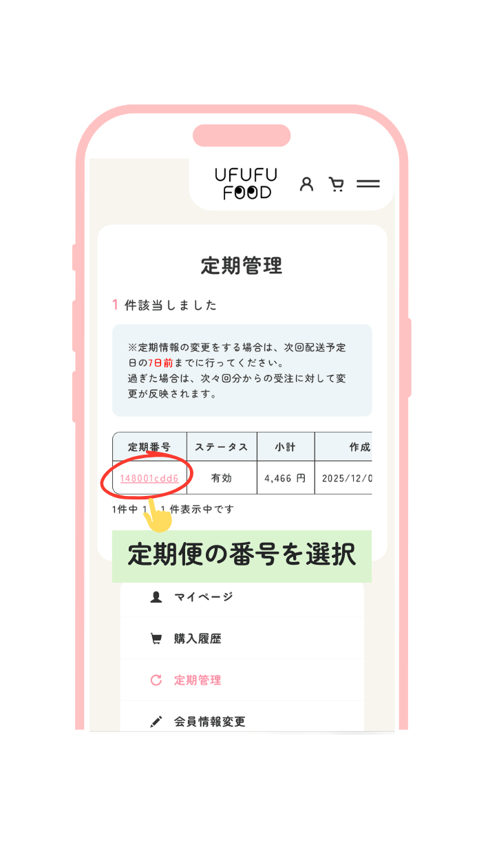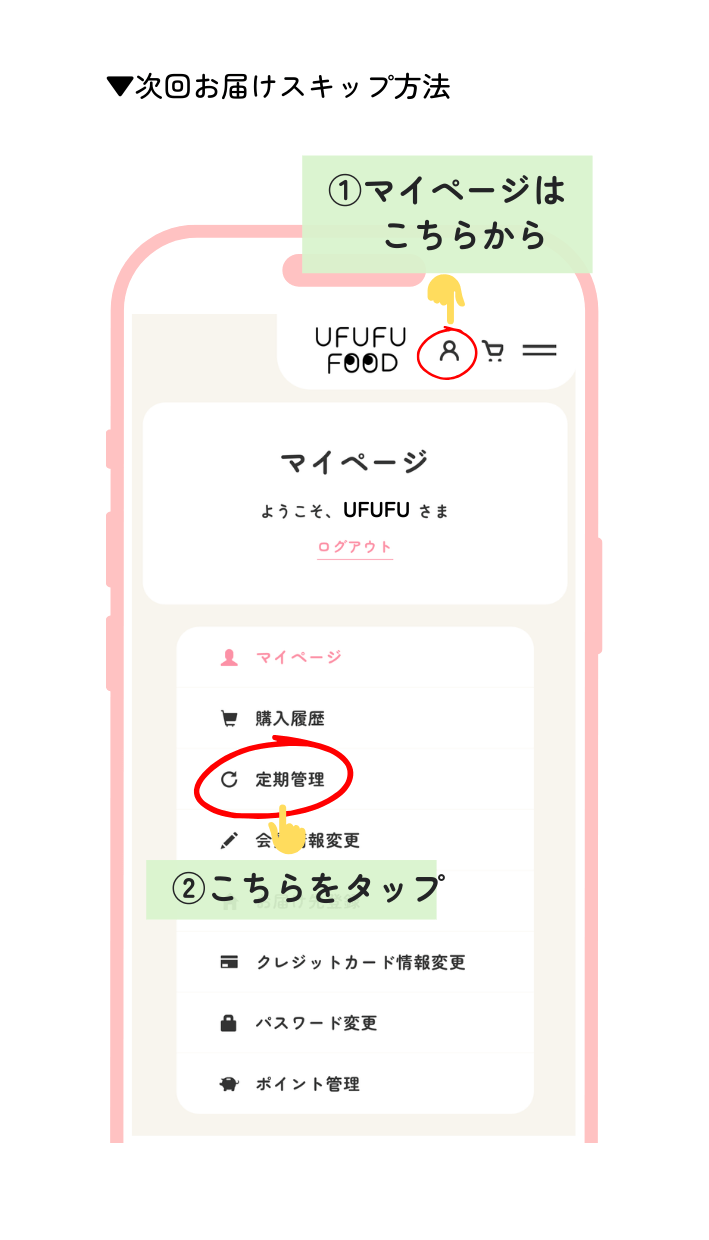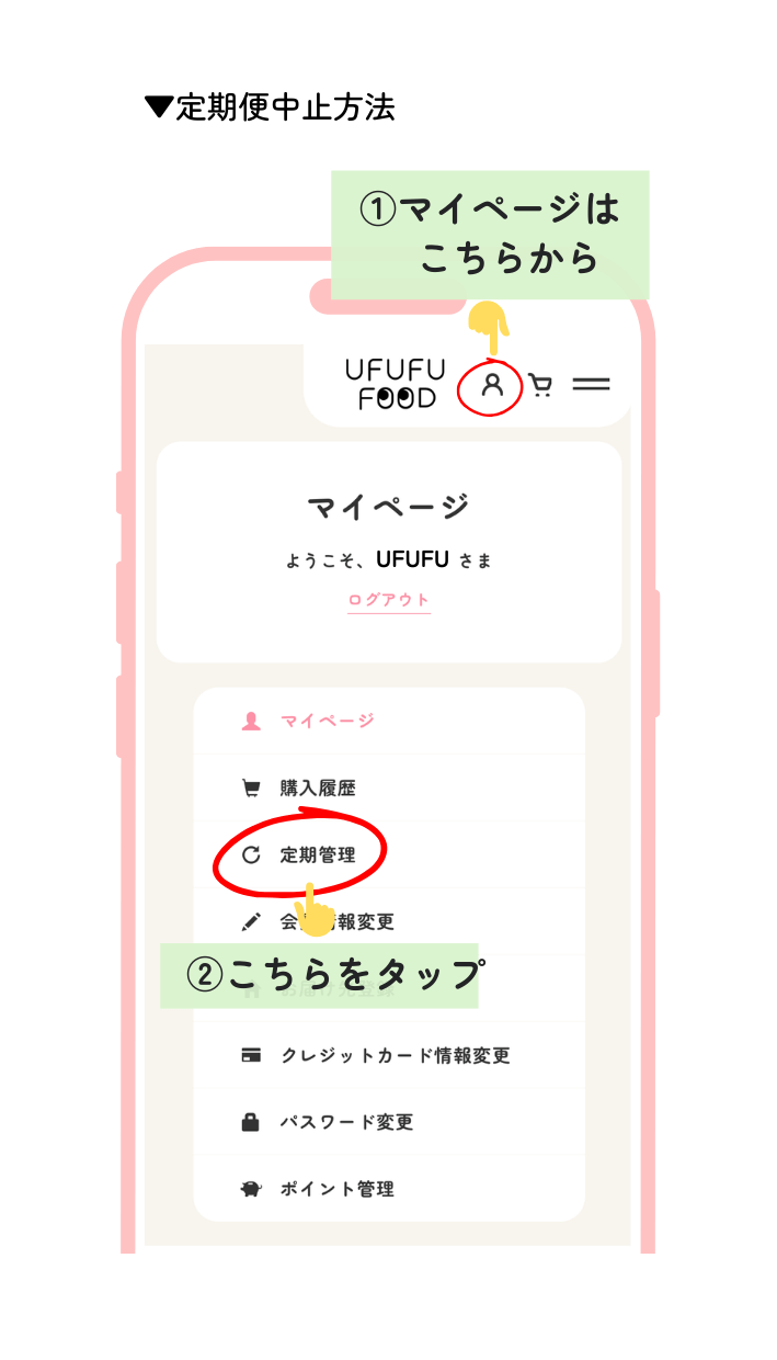 UFUFU FOODの定期便の停止は、マイページからお客さまご自身でお手続きいただけます。