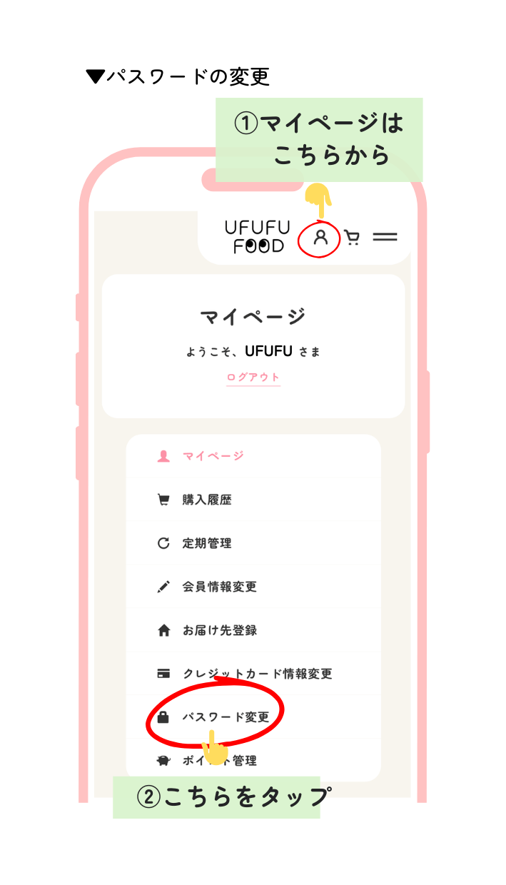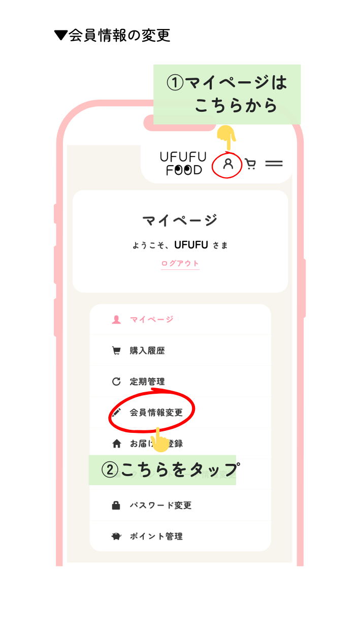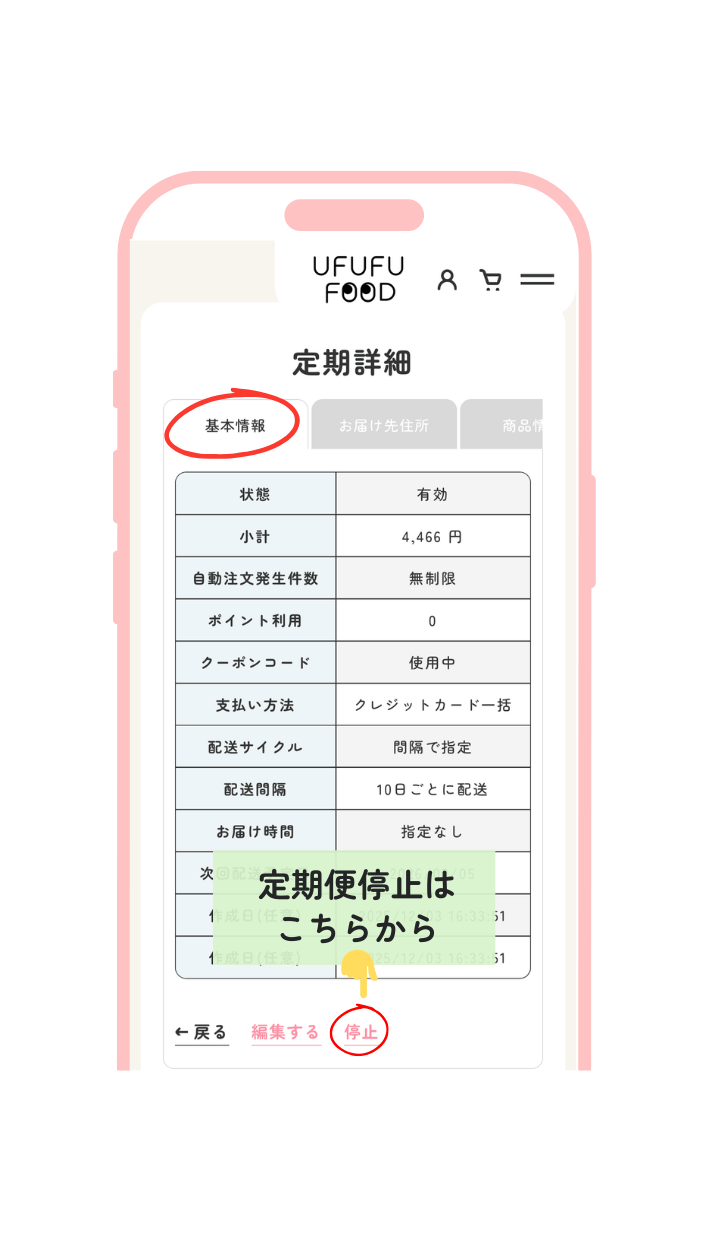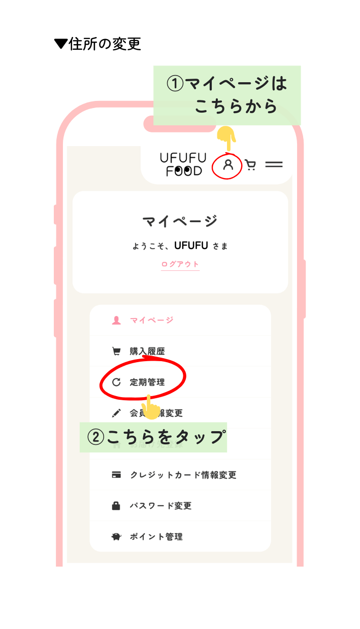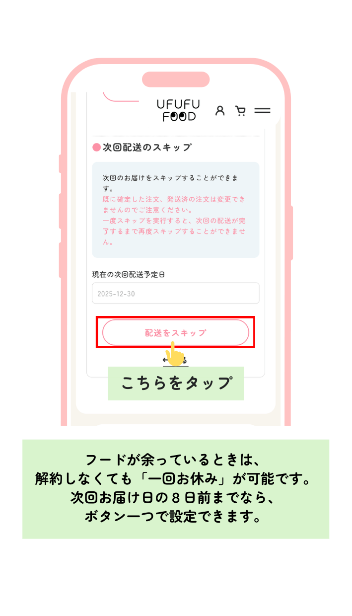 UFUFU FOODの定期便の停止は、マイページからお客さまご自身でお手続きいただけます。