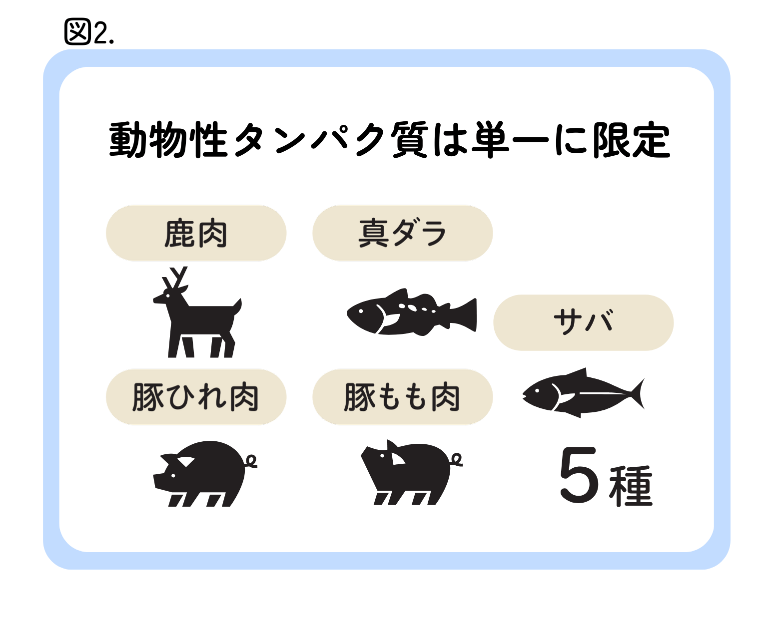 さらに、各製品の動物性タンパク質は単一に限定しています(※図②)。これにより、食物アレルギーの原因を特定しやすく、ワンちゃんに合ったフードを選びやすくなっています。