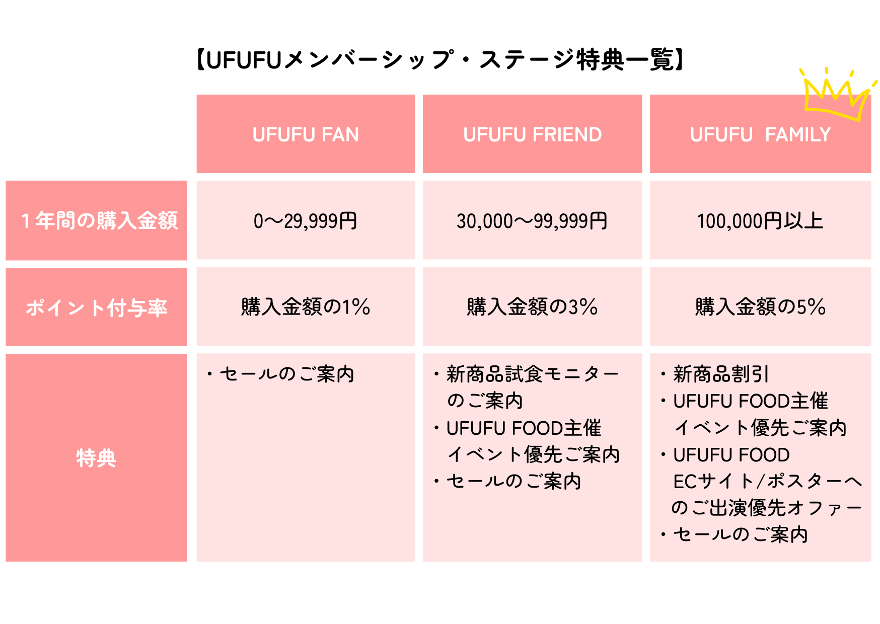 継続してご利用いただくほど、ポイント付与率が最大5%までアップするなど、よりお得にお買い物をお楽しみいただけます。各ステージの条件や特典については、下記の【UFUFUメンバーシップ・ステージ特典一覧】をご確認ください。