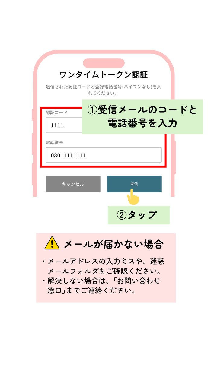 メール送信後に表示された「ワンタイムトークン認証」画面より、「認証コード」と登録済みの「電話番号」を入力し「送信」ボタンを押してください。