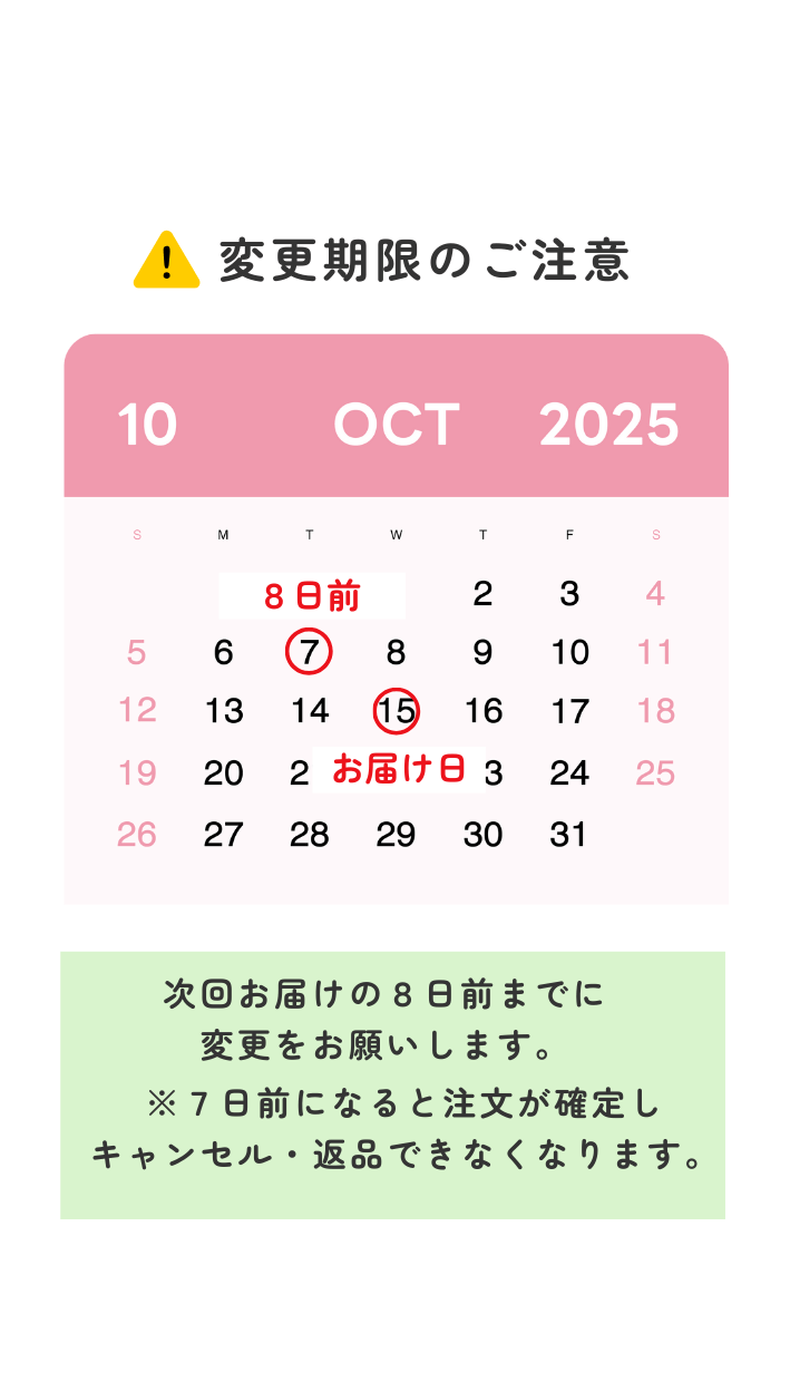 次回のお届けに反映されますのでご注意ください。定期便の変更期限確認方法は下記「▼定期便の変更期限」からご確認ください。