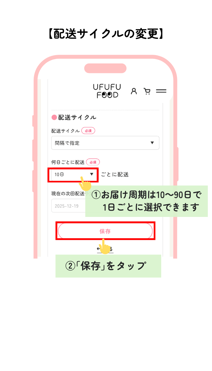 マイページよりお届け周期を10日〜90日に設定することができます。
