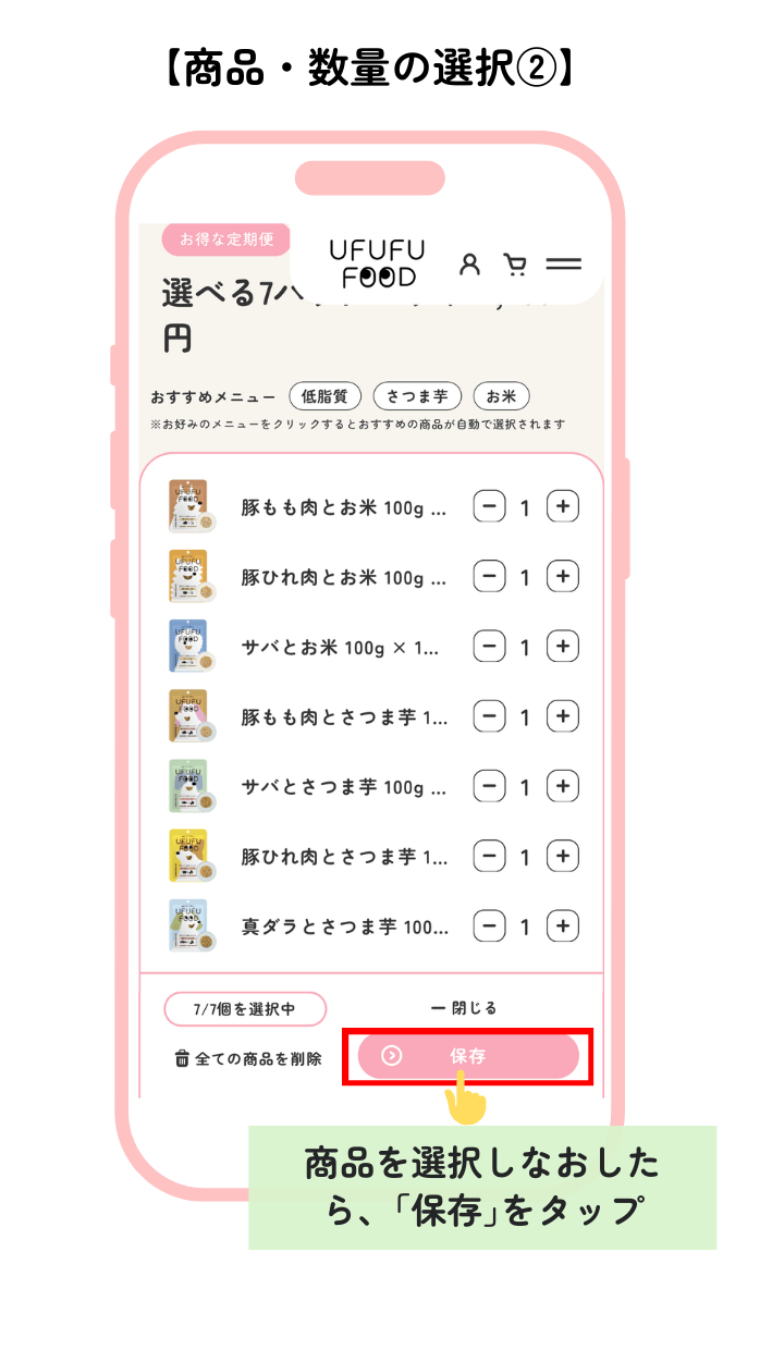 また、商品選択画面にて、食物アレルギーの食材を選択していただくことで、その食材を含むメニューは表示されない仕様になっております。こちらの機能も活用し、ワンちゃんに合ったUFUFU FOODのメニューをお選びいただければと思います。