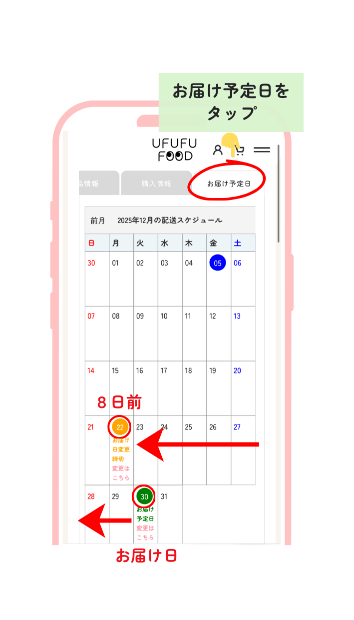 定期便のお届け日時は、次回のお届け予定日の8日前の23:59までマイページから変更いただけます。