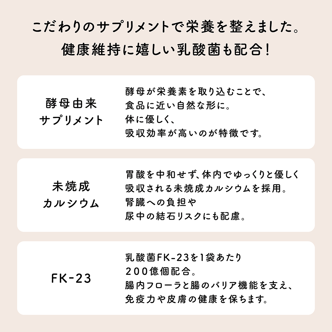 適度な脂質と良質なたんぱく質の豚もも肉が、しなやかな筋肉とエネルギーに満ちた体を育みます。さらに、栄養豊富な「豚レバー」を配合し、目・皮膚の健康を保つビタミンAとスタミナ維持に役立つ鉄分を強化。自然な甘みで食欲をそそるさつま芋が、おなかの調子も整えます。レバーの濃厚な旨味とお芋の甘みが溶け合い、虜になること間違いなし。アクティブなワンちゃんにぴったりです。