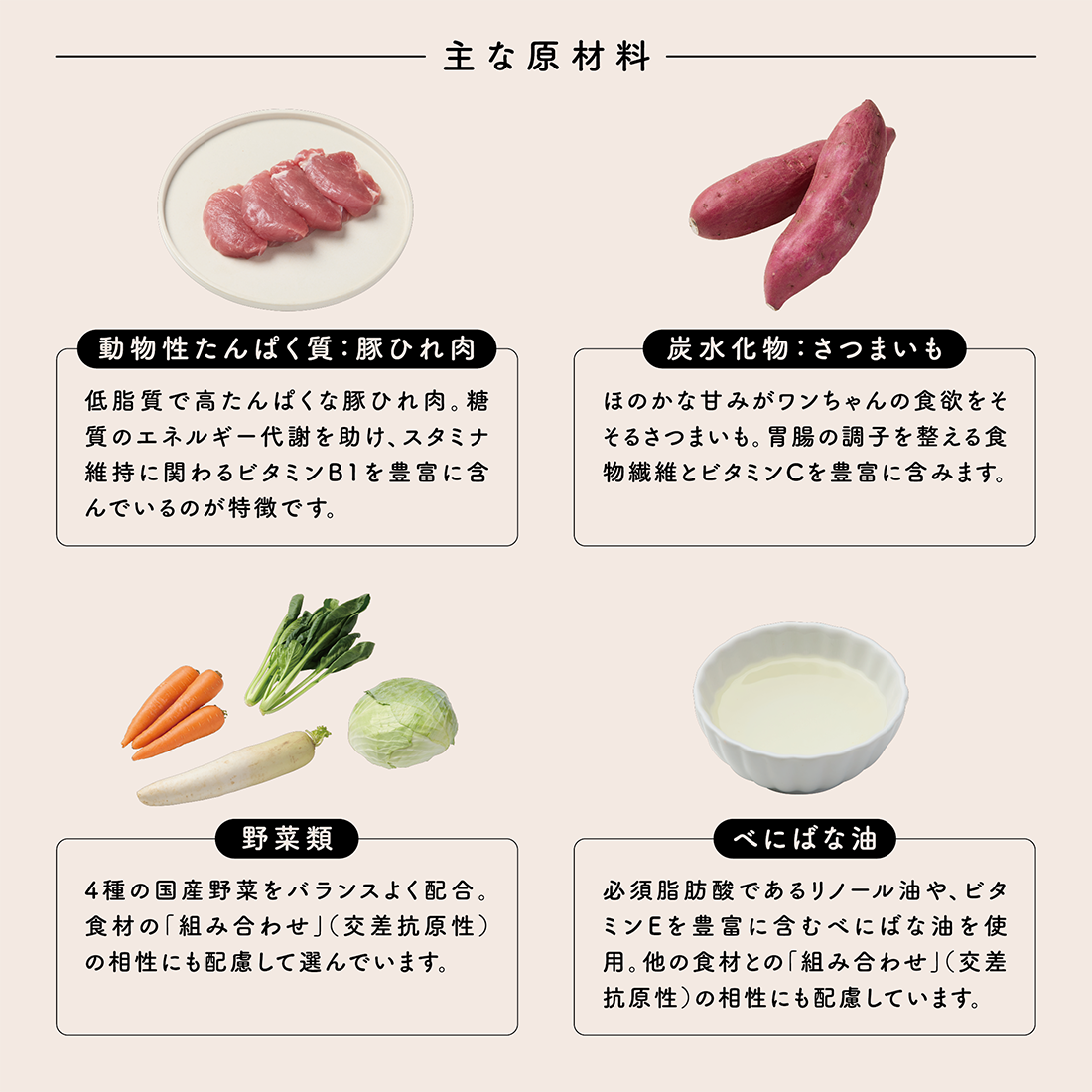 エネルギー産生を助けるビタミンB1豊富な豚ひれ肉に、腸内環境を整える食物繊維たっぷりのさつまいもをプラス。低カロリーですが、豚ひれ肉とさつま芋が口の中でとろけ、満足感のある一皿。食いしん坊のワンちゃんにもおすすめです。