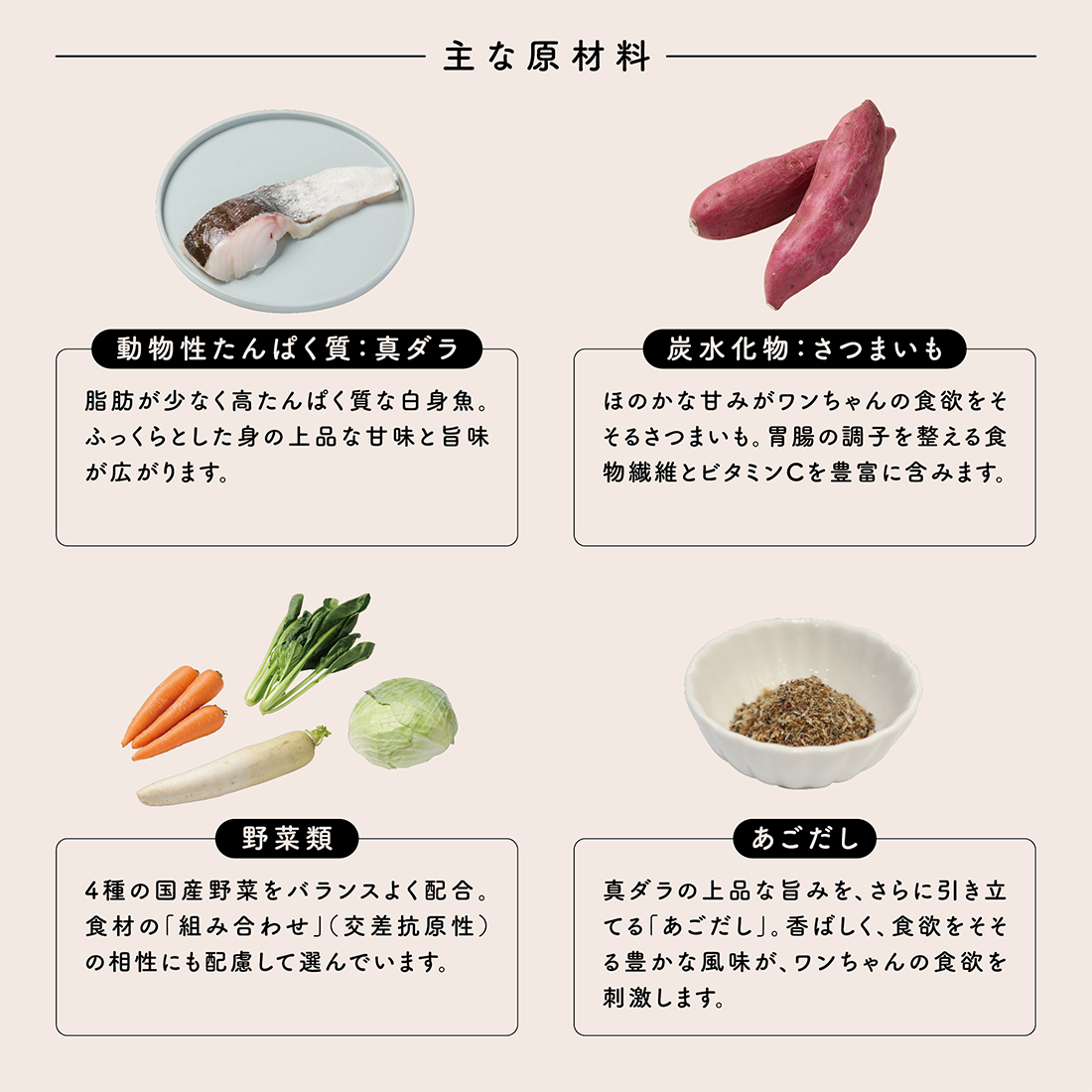 低脂質で高たんぱく質な真ダラが健康な体づくりを支え、豊富なビタミンDが骨と免疫の働きをサポートします。さつま芋と野菜のビタミンCは抗酸化作用で細胞を守り体の内側からワンちゃんの活力をサポート。肉類が身体に合わない子にもおすすめです。